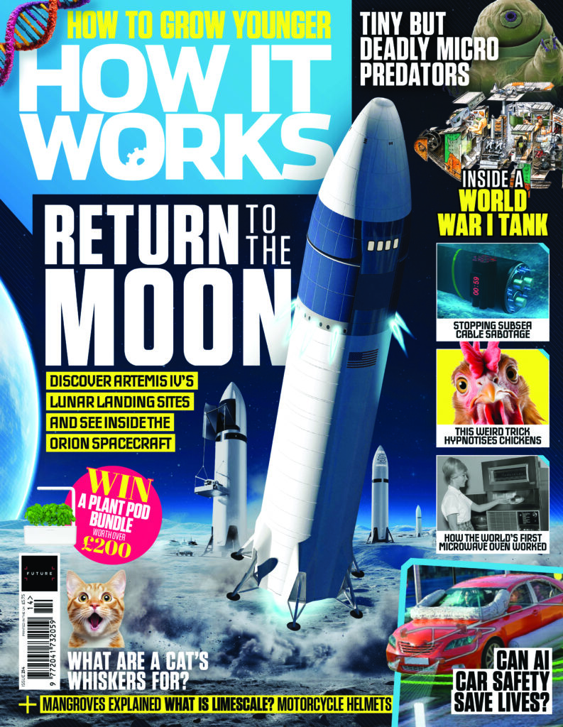 How NASA plans to put astronauts back on the Moon before 2030 and why we haven’t been back to our cosmic neighbour in over 50 years, How to grow younger, What is limescale?, Meet the terrifying micropredators, inside the world’s first combat tank, How to stop subsea cable sabotage, AI car safety systems, Why animals play dead, What a cat’s whiskers are for, and more.